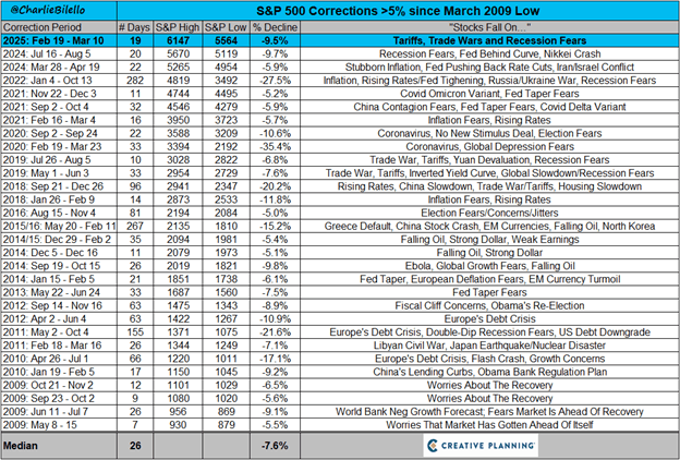 In this current moment, if market valuation/concentration was the kindling, policy uncertainty is the fuel and President Trump lit the match. Every market drawdown has some combination of kindling, fuel, and ignition. Charlie Bilello, from Creative Planning, put together a great chart of every decline greater than 5% since the Great Financial Crisis, along with “why” those pullbacks happened. It’s interesting to look back on some of those events and think about the uncertainty, fear, and the “this time is different” thoughts they caused.