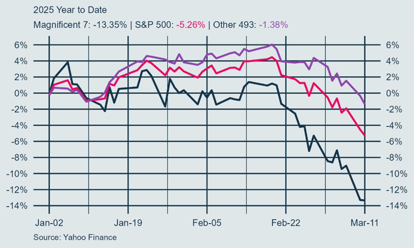 All this unfolds against a backdrop of historically high market concentration and valuations in the major US indices. As previously discussed (link), volatility is amplified when major indices are dominated by high-valuation companies. Indeed, as of market close on Tuesday, the S&P 500 is down just over 5%, with the Magnificent 7 down over 13%. The rest of the S&P is down less than 2%.