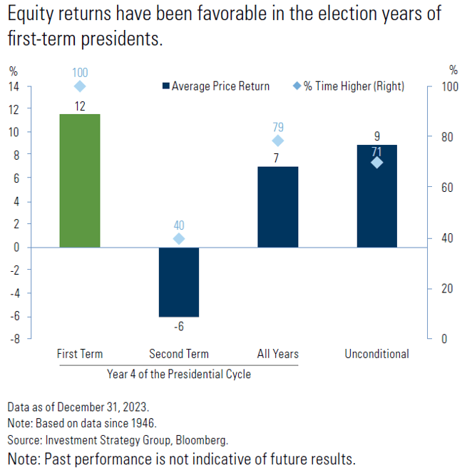 A glance at the chart below reveals that equity returns have historically been favorable during the fourth year of a first-term presidency, with positive outcomes occurring 100% of the time. It's worth noting that the chart tracks results since 1946, encompassing the terms of 12 different first-term Presidents, including Truman, Eisenhower, Johnson, Nixon, Ford, Carter, Reagan, Bush, Clinton, Bush, Obama, and Trump.