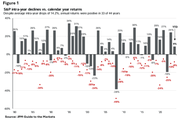So, is this kind of intra-year decline typical? Actually, yes. The chart below (see Figure 1) reveals that the average intra-year drop is around 14%. Therefore, while the S&P 500’s 8.5% pullback over the past few weeks may seem significant, it falls within the range of normal market fluctuations. Given the recent streak of stability, however, it may feel more jarring than unusual.