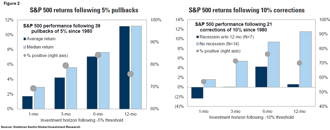 Looking ahead, investors might wonder, “What’s next?” According to the charts in Figure 2, historical data suggests that after corrections of 5% and 10%, market returns tend to be quite positive over both the short and long-term.